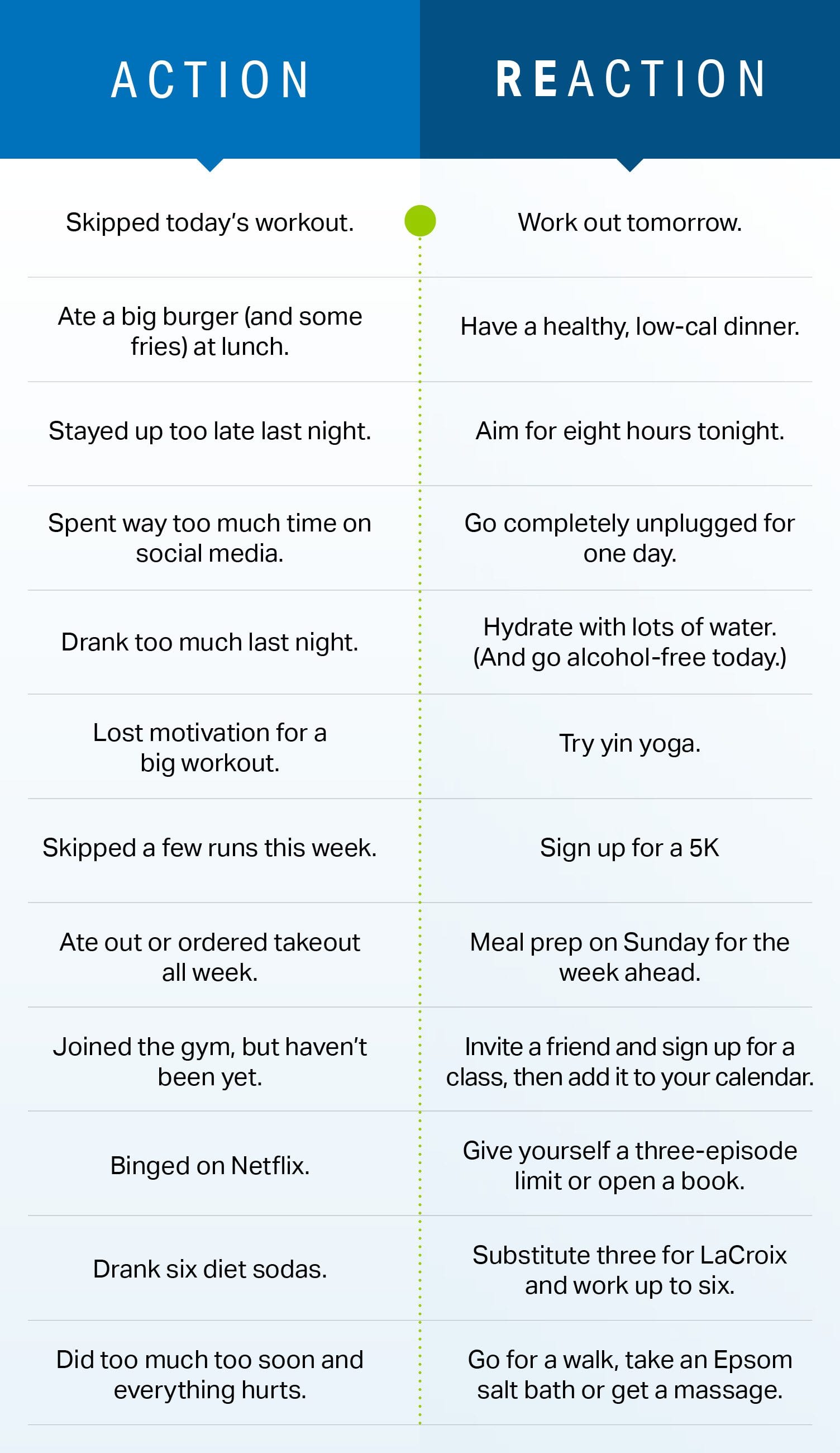 Making healthy lifestyle changes isn’t easy. But rather than banging your head against a wall each time you slip up, just get back on that proverbial horse and try again — ASAP. It also helps to start with incremental changes, rather than sweeping overhauls; you’ll be more likely to keep moving forward. Eventually, you’ll string together a few good days, then a few good weeks and, before you know it, you’ve formed healthy habits for the long term.