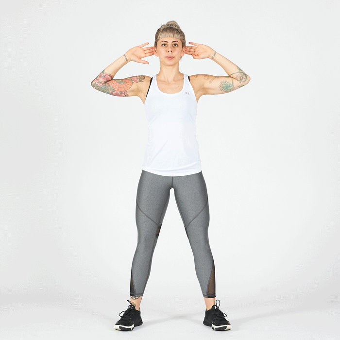 Stand with your legs shoulder-width apart and your toes slightly pointing out. Start the movement by sitting backward and spreading your knees apart. Descend below parallel while keeping your lower back flat. At the bottom, drive through your heels and keep your knees apart as you return to standing. Keep your arms straight in front of you.