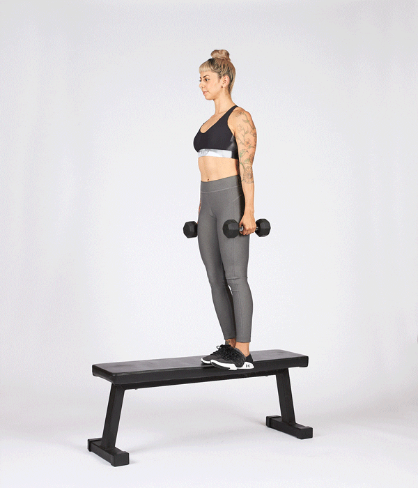 Start by facing away from a bench or box. Lift one leg, sit back onto the bench and come up without putting your other leg down. To make it harder, lower the bench.