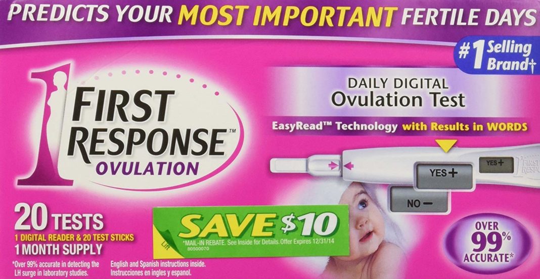 The First Response ovulation test (pictured above) comes with a digital reader and 20 sticks to test your LH levels each day. The reader remembers your levels throughout the month, so it can effectively alert you of an LH surge (displayed with a simple YES or NO- on the screen).
