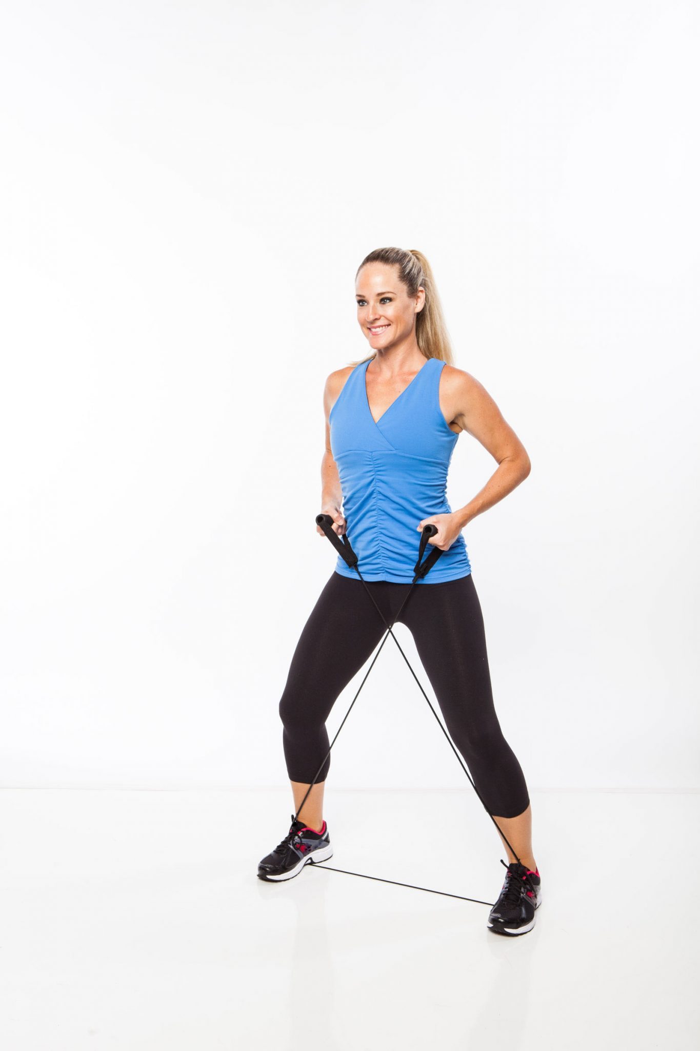 To do it: Stand on a resistance band with feet hip-width apart, knees slightly bent, holding onto handles evenly (depending on your band’s thickness, you may need to cross it as shown for more resistance).