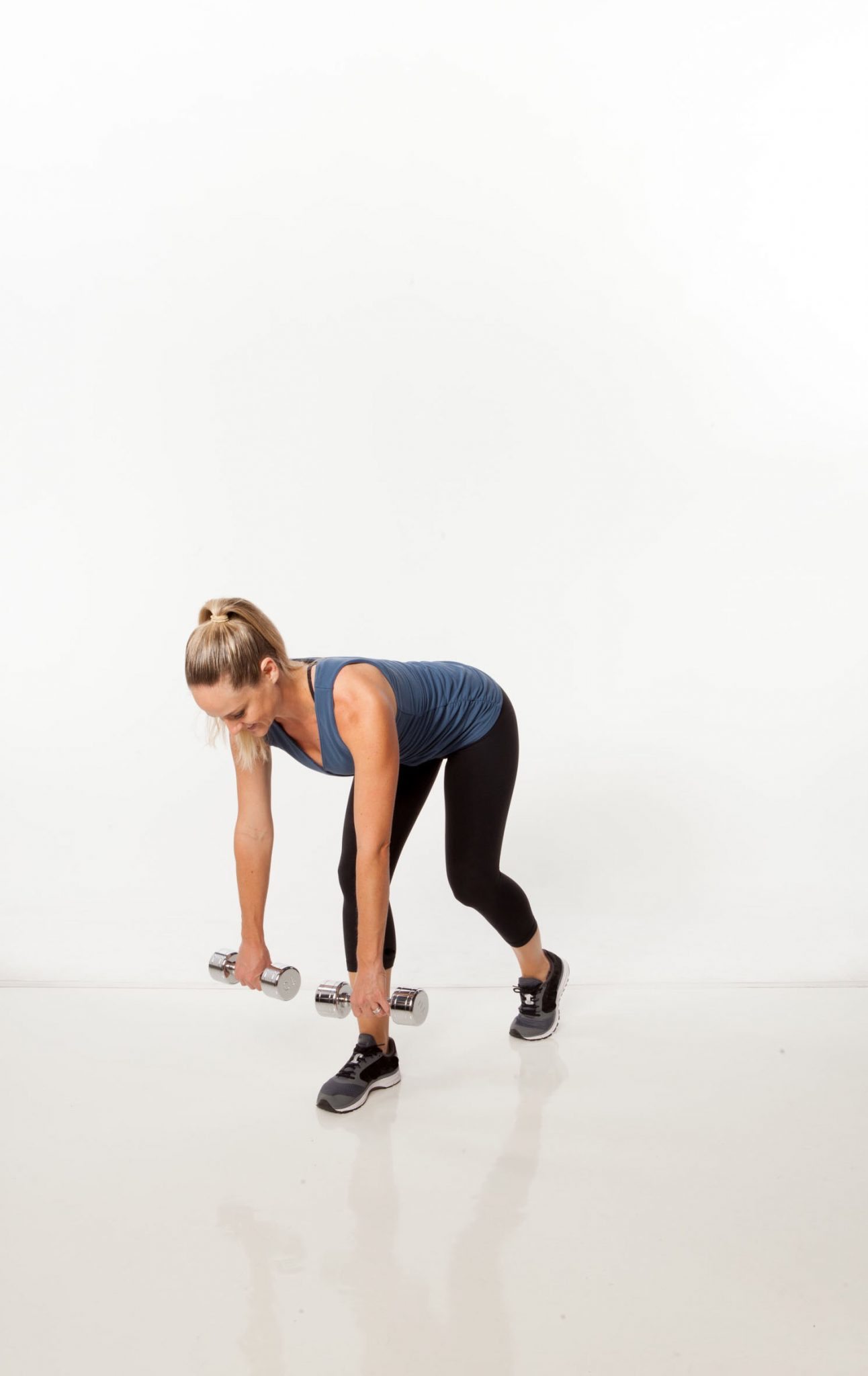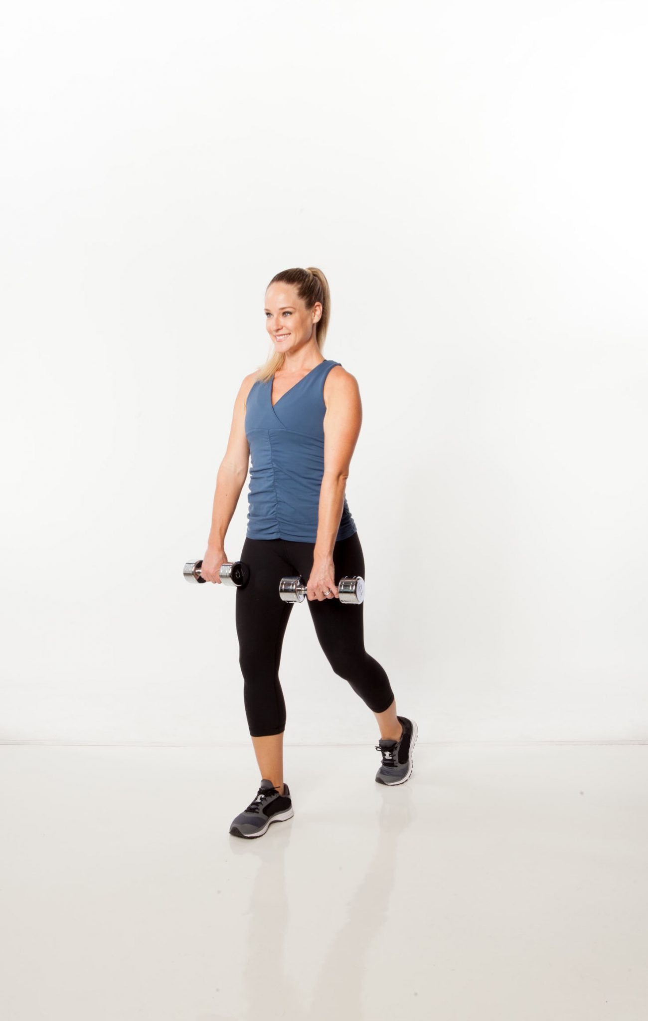 To do it: Begin in a split stance with one leg forward and the back heel lifted, knees slightly bent, holding a dumbbell in each hand with palms facing thighs.