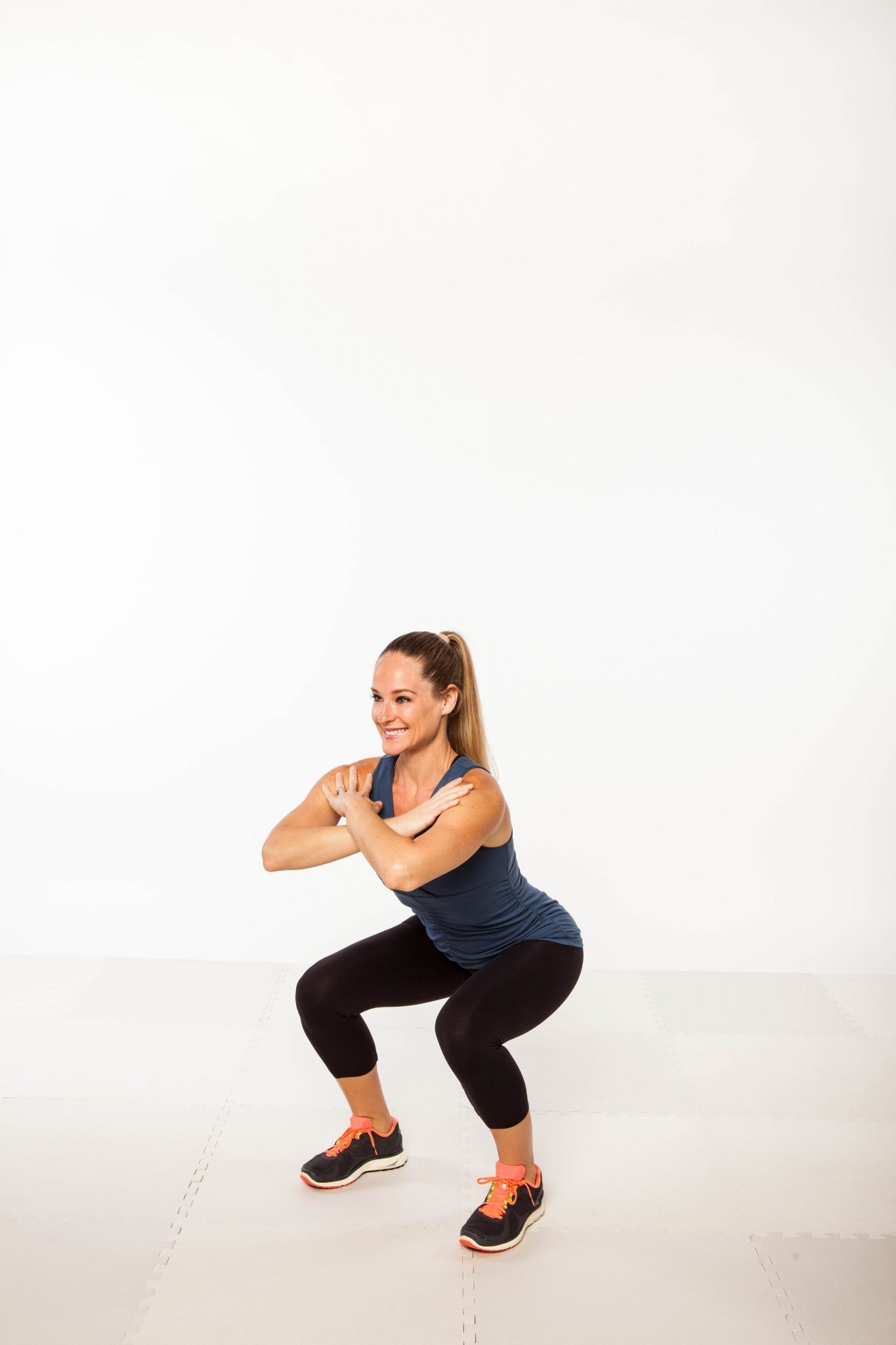 To do it: Stand with your feet hip-width apart with your arms crossed over chest. Lower into a squat by pushing your hips back (as if you were about to sit down in a chair), keeping chest lifted and knees behind toes. Hold for 30–60 seconds, then stand back up.