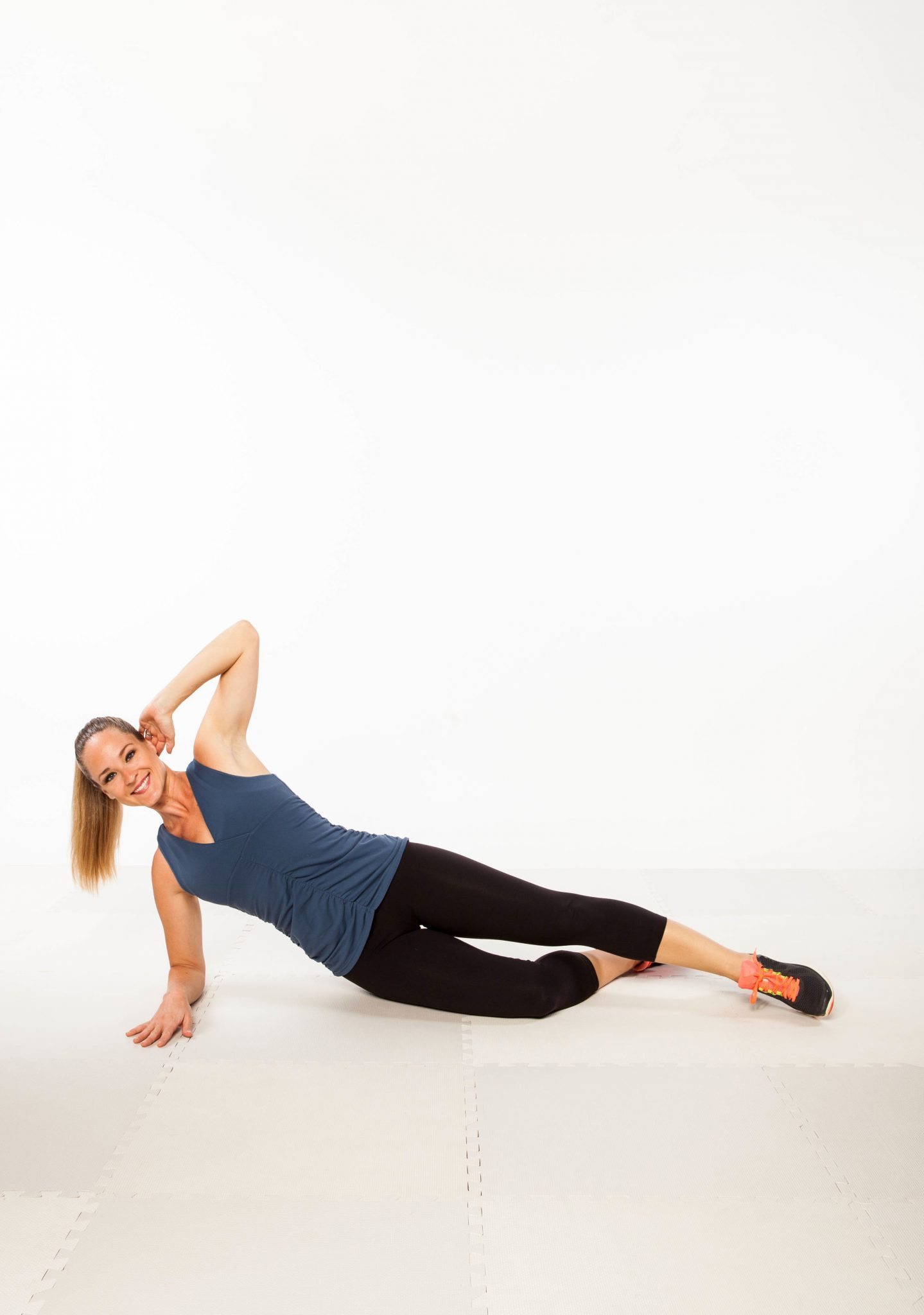 To do it: Start by lying on your side with your upper body propped up by your bent elbow and your opposite hand resting on your head. Extend both legs out to the side, bending bottom knee (keep both knees and hips stacked).