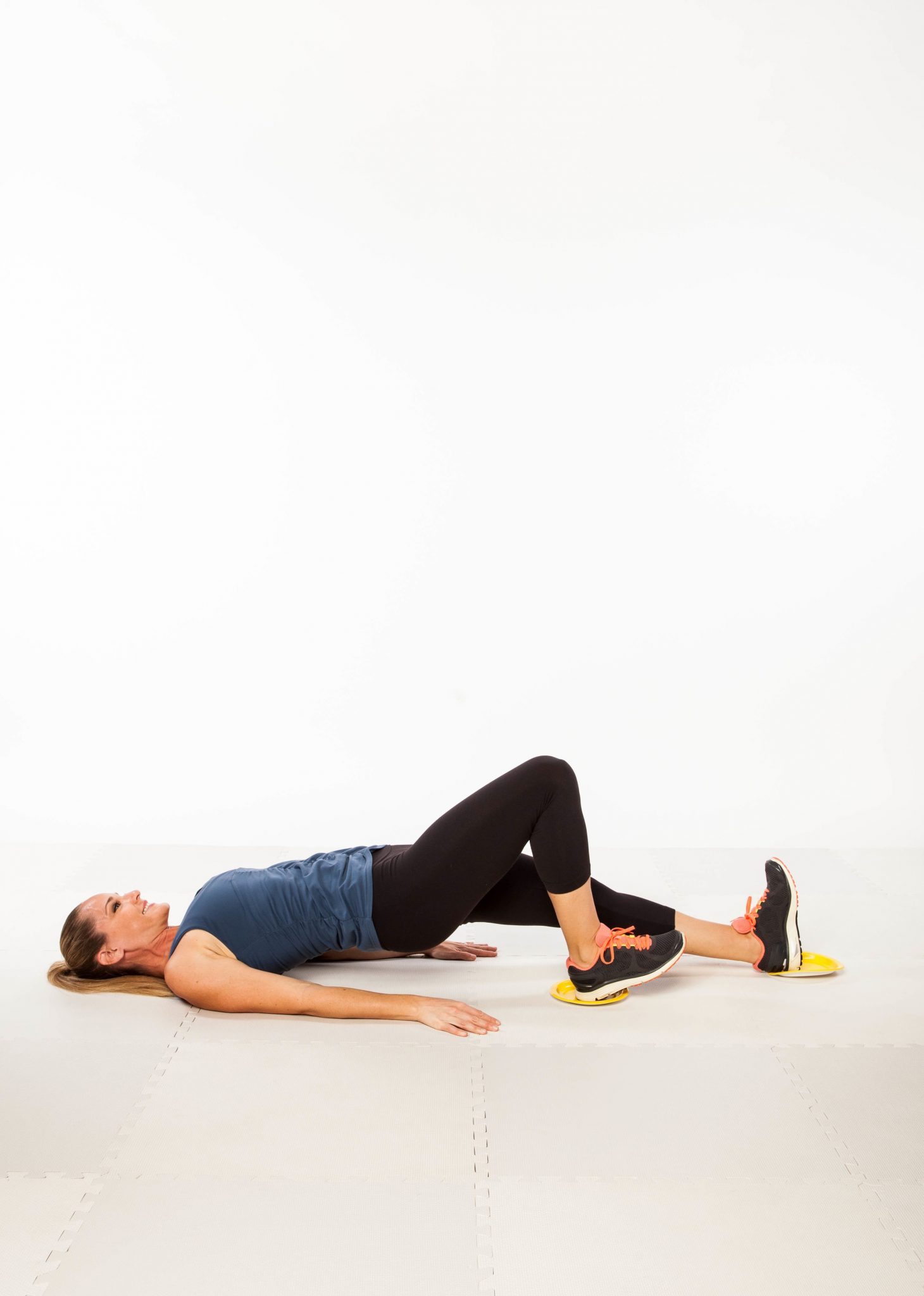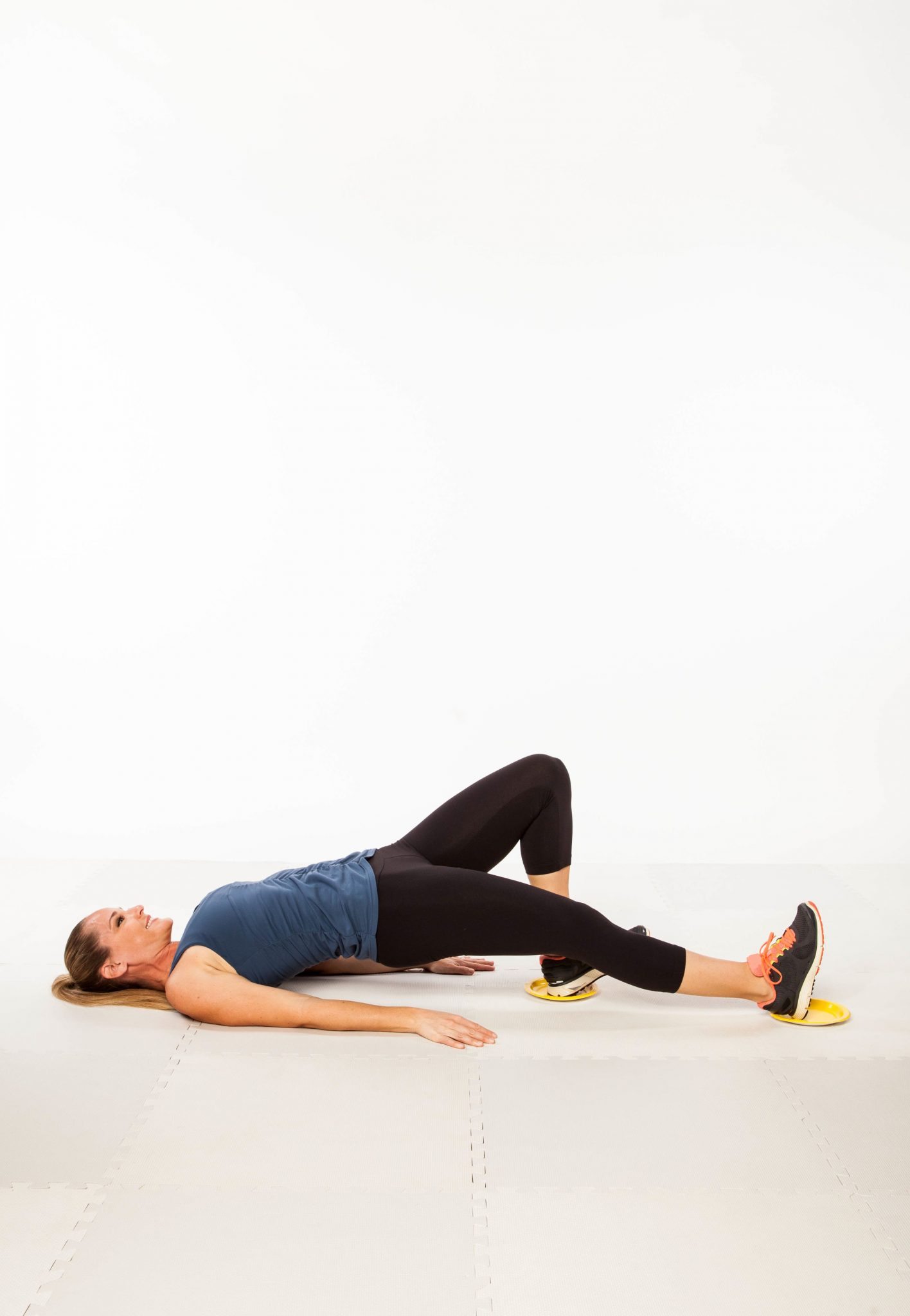 To do it: Start by lying on your back with your arms by your sides, knees bent, feet flexed, with heels pressed into centers of paper plates (try paper plates on a carpet, or two folded towels on hard floors). Lift your hips off floor and slide 1 foot out, extending the leg out (keeping your heel pressed against plate or towel) [A].