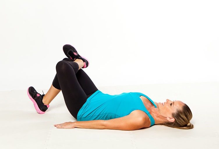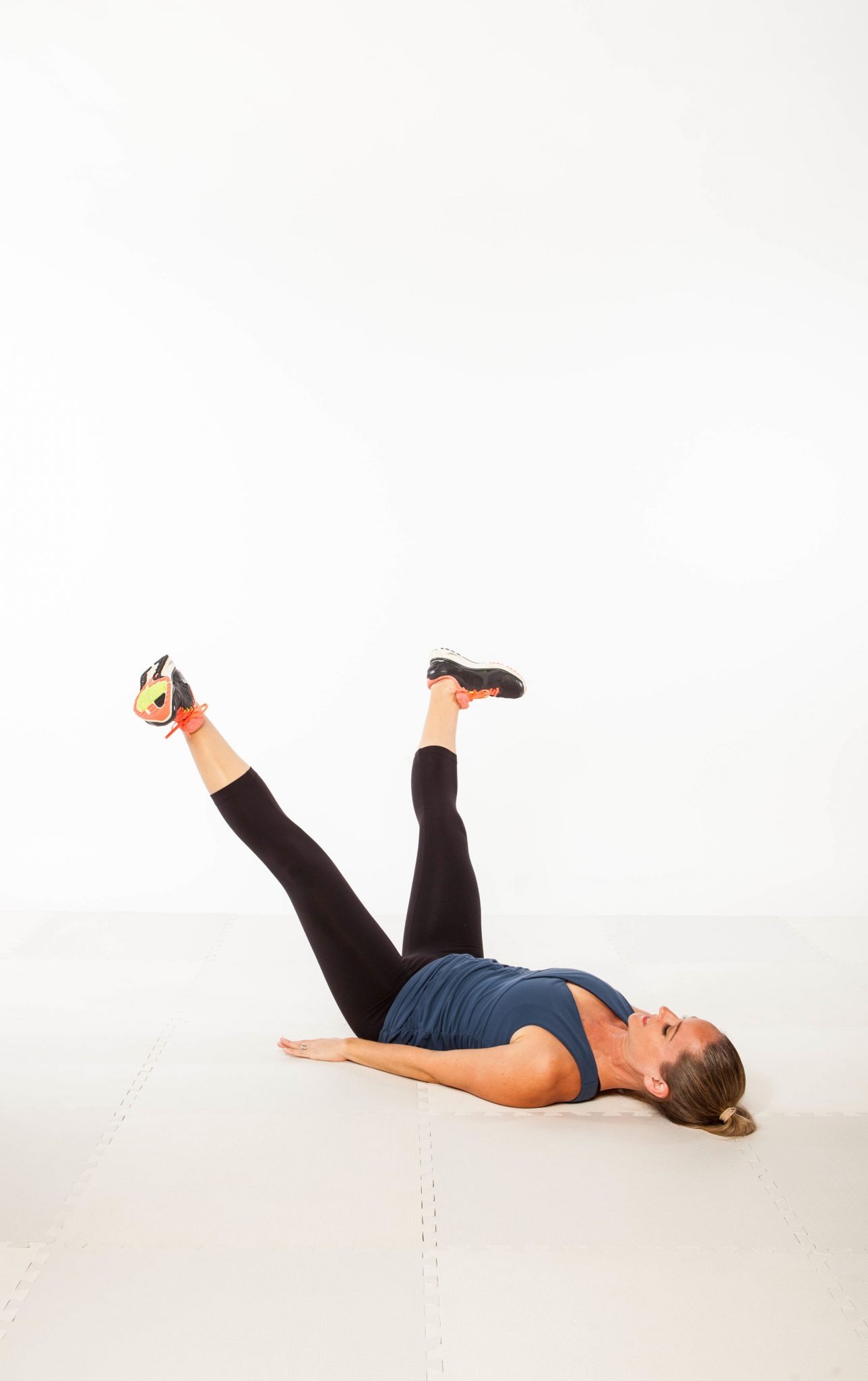 To do it: Begin by lying on your back with your arms by your sides, both legs extended straight up over the hips. Flex the feet and turn the legs out about 45 degrees, keeping heels touching. Brace abs in tight, and lower legs about 45 degrees toward the floor (avoid arching lower back).