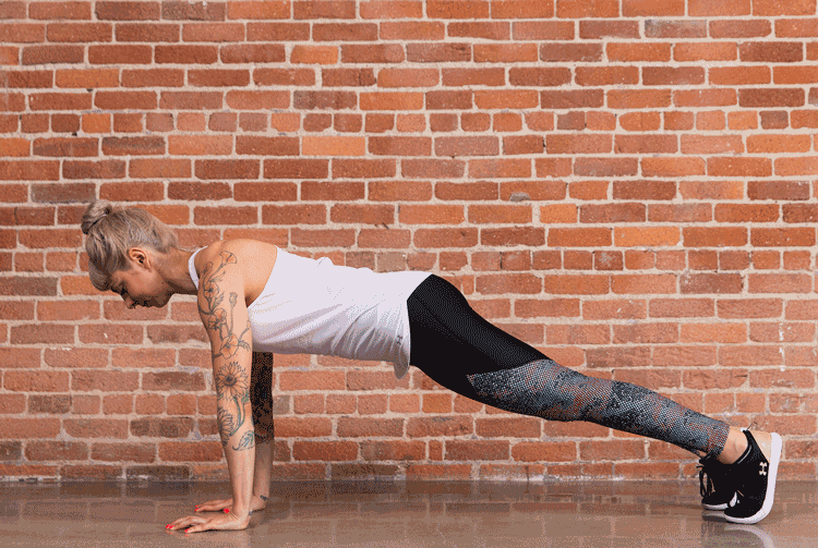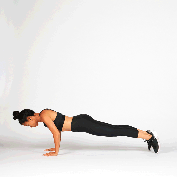 Get in a pushup position with your hands about shoulder-width apart. Keep your lower back flat and don’t let your hips sag. Lower yourself and keep your elbows close to your body as you descend.