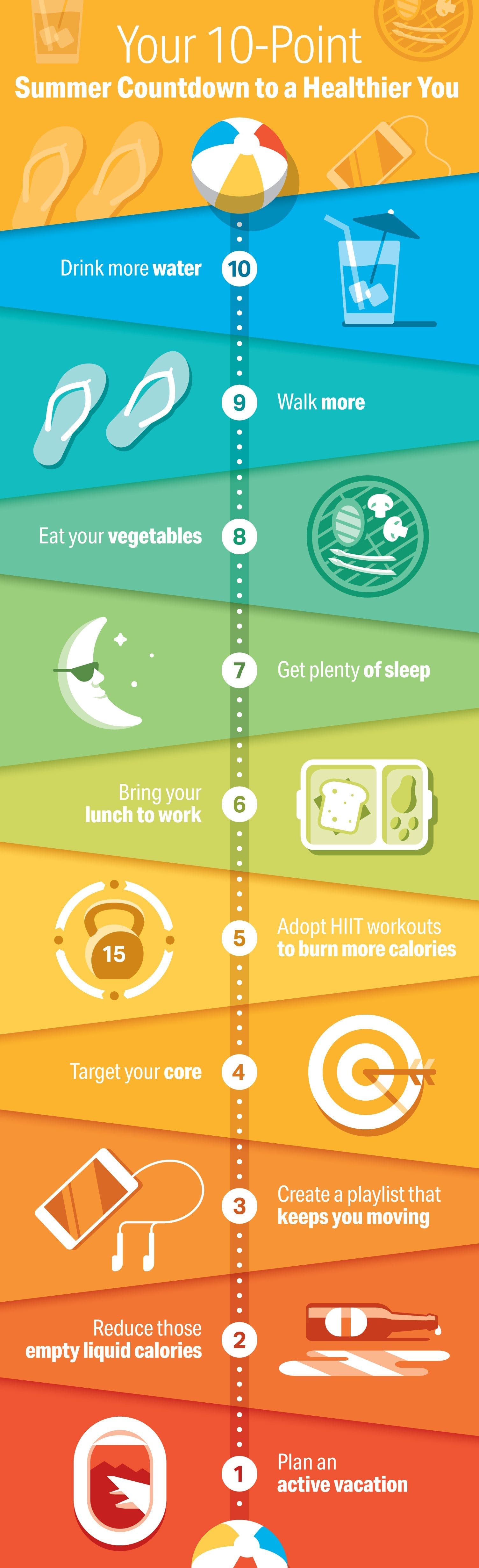 This 10-point summer countdown will help. Some of these healthy lifestyle tips are ones you already do and some might need some extra work to become second nature. Either way, this plan is meant to be flexible.