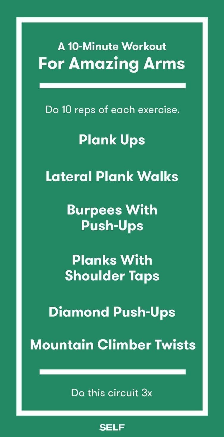 Repeat 3x:• 10 Plank Ups • 10 Lateral Plank Walks • 10 Burpees With Push-Ups • 10 Planks With Shoulder Taps • 10 Diamond Push-Ups • 10 Mountain Climber Twists