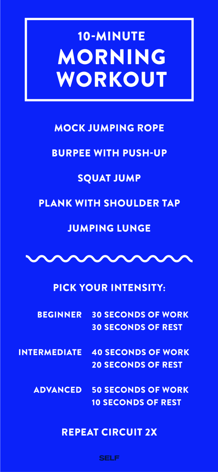 The perfect routine if you’ve only got 10 minutes to spare (and no extra time to get ready again afterward). It was developed for SELF by Jessica Bolbach, owner of NYC fitness studio KORE. Get the workout details.