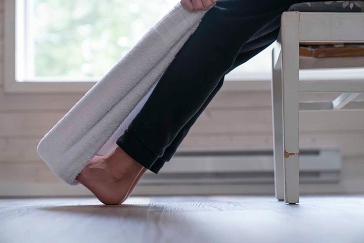 - Place a towel around your foot, under your toes, holding an end of the towel in each hand.