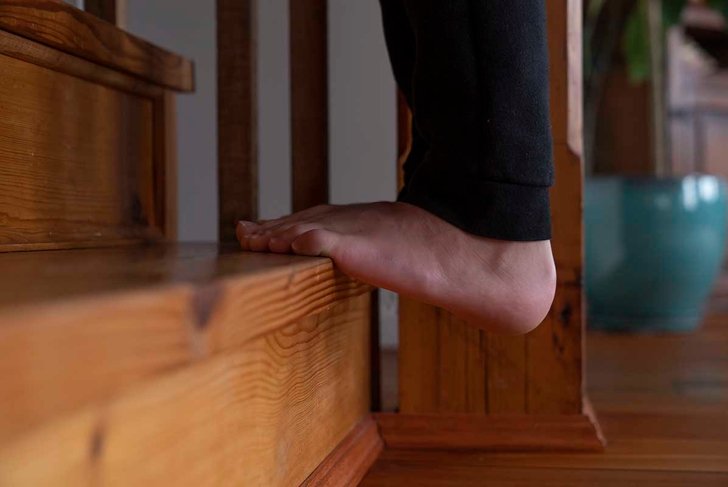 - Standing on a stair step, hold onto the railing as you slowly drop your heels over the edge of the step and relax your calf muscles.