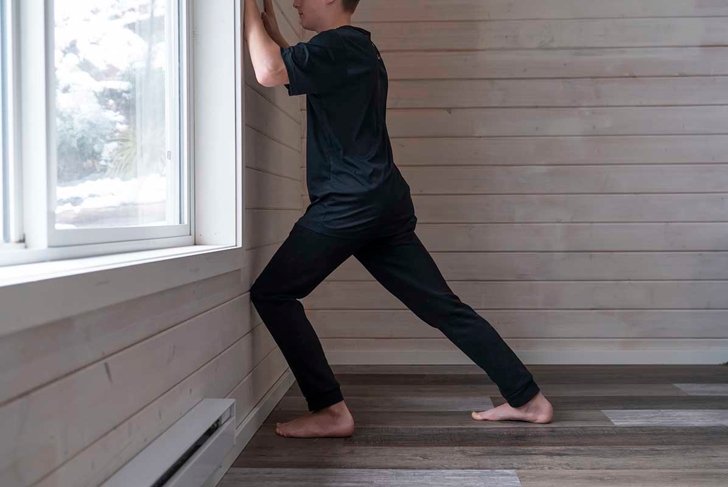 - Keep the heel of your back leg on the floor, bend your front knee until you feel a stretch in the back leg.