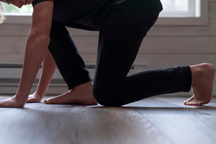 - With your hands and knees on the floor, point your heels up and place your toes and the balls of your feet on the floor.