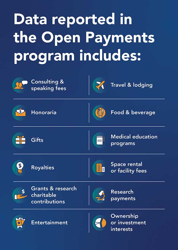 When searching for a new provider, another important area to consider is financial relationships. One resource patients can consider is Open Payments, a national disclosure program within CMS that provides visibility into financial relationships between drug and medical device companies and physicians, and teaching hospitals. The government requires pharmaceutical companies, device manufacturers and group purchasing organizations to report funds they give health care providers in the form of meals, entertainment, travel, gifts, consulting fees, research payments and more, promoting transparency and helping uncover potential conflicts of interest.