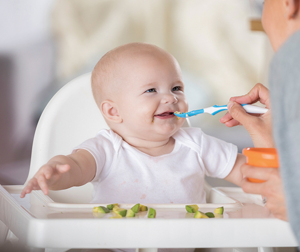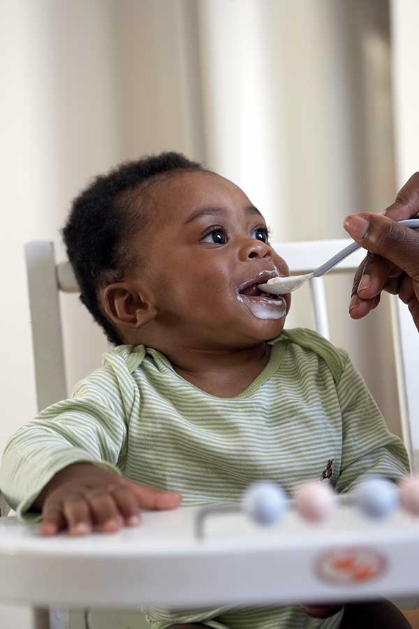 Make sure your baby is sitting up and secured in a highchair. Use a soft, rubber-tipped spoon and start by guiding the spoon to your baby’s mouth with both your hand and your child’s hand on the spoon.