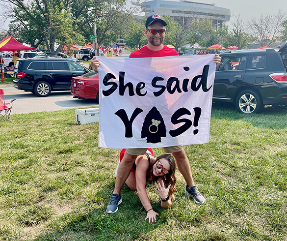 Jordyn Burnidge and Chad Clauser won the chance to be the first couple married at a Chiefs home game through the contest conducted by Helzberg Diamonds, a corporate partner of the team. The couple got engaged last September at the regular season home opener, so it’s only appropriate for the wedding to occur at the last regular season home game on Dec. 26.